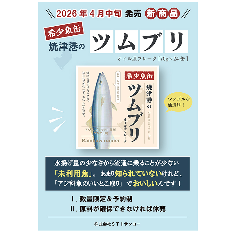 【中部発】静岡県焼津市のSTIサンヨーは16日、希少性が高いアジ科のツムブリ使用の缶詰を静岡県と神奈川県の一部量販店で数量限定発売する。橋本貴史社長は「地元焼津港の課題解決に貢献するとともに、独自価値でも勝負する」と意気込む。今回、同品を含む4商品を紹介する。(宇佐見勇一)