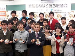 全国納豆組合連合会(全納連)は8日、1月10日の「糸引き納豆の日」を記念し、東京都新宿区の早稲田予備校で受験生応援イベントを開催した。会場には、タレントのラサール石井が駆けつけ、「テストは最後まで諦めては駄目。ねばり強く頑張って」と受験生にエールを送った。 納豆は、そのねばり強さと糸を引く性質から、試験や勝負事に縁起の良い食べ物とされている。また、栄養価が高く、健康な身体の維持に欠かせない食品として知られ、入試を控えた受験生にぴったりの栄養食品だ。