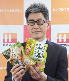 ハナマルキは即席スープ市場に参入する。拡大するスープ市場で簡便・本格・徳用をキーワードに、味噌汁で実績のあるシジミを使用した商品を投入する。拡大が続くスープ市場を深耕するのが狙い。7日に東京本社で行われた新商品発表会では、香りに焦点を当てた味噌汁や既存シリーズのプレミアムタイプの発売も発表された。 即席スープの第1弾として、3月1日に「からだに嬉しいしじみわかめスープ12食」を発売する。1食当たりシジミ80個分のオルニチンを配合し、飲酒後の飲用を提