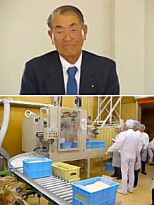 大久保周三郎会長(上)、茂野製麺茨城工場の見学会風景(下)