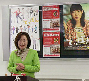 東京会場(ブルドックソース本社)であいさつする佐竹佐知子会長