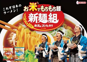 エースコックは、新潟産コシヒカリの米粉を小麦粉に練り込み、もちもち食感を実現させた即席袋麺「お米でもちもち ラーメン新麺組」を全国拡大するのに当たり、新TVCMを25日から全国で放映中。