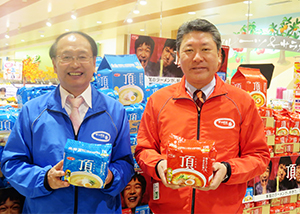 店頭に立ち、「サッポロ一番 頂」をアピールする水上幸重サンヨー食品販売社長(右)と杉村壽哉サンヨー食品常務