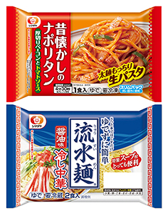 シマダヤの14年春夏商品は、家庭用チルド麺では「流水麺」のさらなるブランド強化を図るため、2食スープ付冷し中華(写真(下))や関連つゆなどのラインアップ、冷し中華・和風生麺・焼そばの3カテゴリーでプレミアム商品投入、家庭用冷凍商品では「昔懐かしのナポリタン」リニューアル(同(上))、業務用冷凍商品では「ゆであげ生パスタ」デュラム入りシリーズ新発売などパスタカテゴリーの商品力を強化した。 〈家庭用チルド麺〉(1)「流水麺」ブランド戦略=ゆでずにさっと