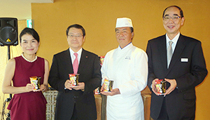 右から、なだ万谷田部二郎会長、同社統括本部商品開発室加藤道久室長、日清食品取締役中田圭二営業本部長、同社取締役ズナイデン房子マーケティング部長