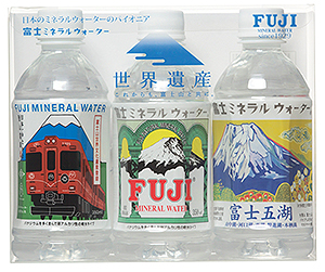 富士急グループの富士ミネラルウォーターが、富士山の世界文化遺産登録を記念した「富士山ラベル3本セット」=写真=の販売をこのほど開始した。山梨・静岡エリアの物産店や土産物売場、CVSを中心に販路を拡大、2014年3月末で1万ケース(1ケース8セット入り)の販売を目指す。 同製品は、「富士登山電車」「富士ミネラルウォーター」「富士五湖」の3種類のラベルに「富士山世界文化遺産登録」のロゴを加えた特別仕様。採水地は山梨県富士吉田市。富士山に降った雨水や雪解