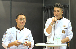 山崎隆二日本アンバサドール協会理事(カネカテクニカルアドバイザー)と谷口佳典モンディアル・デュ・パン日本代表(フリアンドシェフ・ブーランジェ)は10月23日、「FABEX関西2015」関西デザート・スイーツ&ドリンク展プレゼンテーションステージで、パンの世界大会モンディアル・デュ・パン選手団によるパンの食べ方提案と大会の結果報告を行った。 今年9月にフランスで開催されたモンディアル・デュ・パン~味覚と栄養~の日本代表として出場した谷口シェフは、「総