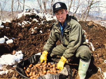 粘土層の畑で、雪の中で熟成したメークインを取り出す高須栄氏
