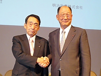 がっちり握手を交わす佐藤尚忠 明治製菓社長(左)と浅野茂太郎 明治乳業社長=11日の経営統合会見で