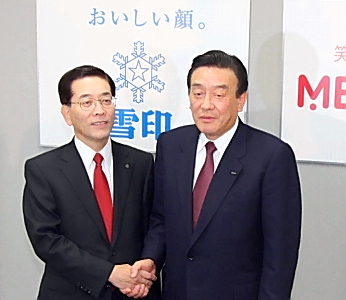 雪印乳業(雪乳)と日本ミルクコミュニティ(日本MC)は今年10月1日に経営統合し、共同持ち株会社雪印メグミルク(株)を設立する。27日の会見で雪乳の高野瀬忠明社長は、統合で元の雪印に戻らず「次の成長へ向けた出発点」とし、日本MCの小原實社長は「名実ともに日本一の総合乳業メーカーを目指す」と意気込む。新会社は、早期にシナジー効果創出を確固としたものにするため5年間で800億円の“攻め”の投資を実施、研究開発費は100億円超を投じる。5年後の13年度売上高目標5900億円(08