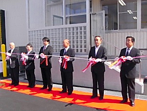 テープカットを行う桜井勝郎島田市長(右から2人目)、河合和寛中央輸送社長(同3人目)、竹本行雄三和流通産業社長(同4人目)