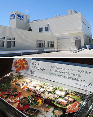 (上)テストキッチンなどを併設し商品開発力も強化した第四工場(下)明太子ねぎとろやねぎとろのアウトパ ックなど、新しいマグロ加工品を提案 (写真は日本アクセス秋季展示会)
