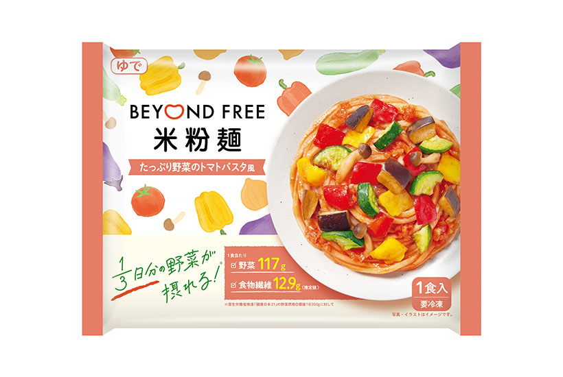 テーブルマークは5日から、植物生まれの冷凍ミールブランド「BEYOND FREE(ビヨンドフリー)」から、新商品「米粉麺たっぷり野菜のカルボナーラ」「同トマトパスタ風」2品をオンラインショップで発売。独自開発のもちもち食感が楽しめる米粉麺に特製ソースを絡め、ソースや具材に3分の1日分の野菜をたっぷりと使用したヘルシーで満足感の高い一品に仕上げた。 独自に開発した中太麺の米粉麺に植物生まれの特製ソースを絡め、ヘルシーながらも満足感のある味わいに仕上げ