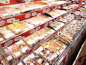 いなげやは、西東京富士町店(=11月13日開店、東京都西東京市)でこれまで取り組んだ部門を横断した売場作りのノウハウを導入し、生鮮の半調理品など簡便商品を集合陳列し、惣菜売場も拡充した。生鮮と惣菜の売上構成比52%を想定し、同社の商品施策の方針である惣菜を柱にした店作りを深耕する。来年4月には惣菜子会社のクックサンを吸収合併し、より部門間の連携を本格化させる。新店の初年度の年商目標は惣菜込みで14億円を見込む。 新店では、青果売場から鮮魚売場の中間