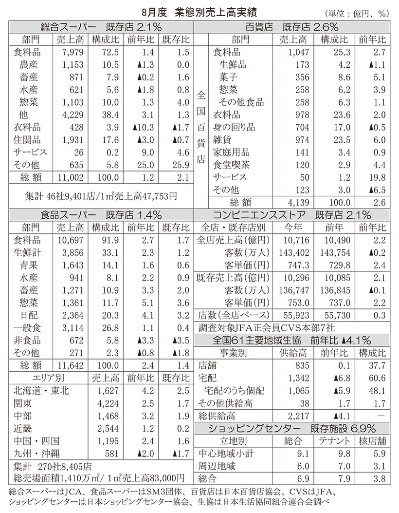 ●団体・生協統計=百貨店7ヵ月ぶり増加 8月度の小売業界団体と