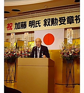 【中部】加藤明氏(大雄調理士紹介所代表、愛知県調理師会副会長、72歳)は昨年秋の叙勲で「旭日単光章」の栄誉に輝いたが、11日に名鉄グランドホテルで調理師関係者ら300人が集い、盛大に受章記念祝賀会を開催した。 祝賀会には小畠弘太郎日本全職業調理師協会会長、伊藤理夫愛知県調理師会会長を発起人に、各地の調理師団体のそうそうたる顔ぶれが揃い、和食界のドンの叙勲を祝った。 加藤氏(写真)は六十年余にわたり和食一筋に調理師の世界に君