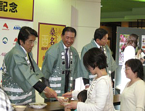 試食を振る舞う水谷市長(左)と、三林社長