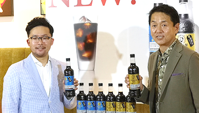 発売前日の発表会に臨んだサントリー食品インターナショナルジャパン事業本部の大塚匠課長(左)とミカフェートの川島良彰社長