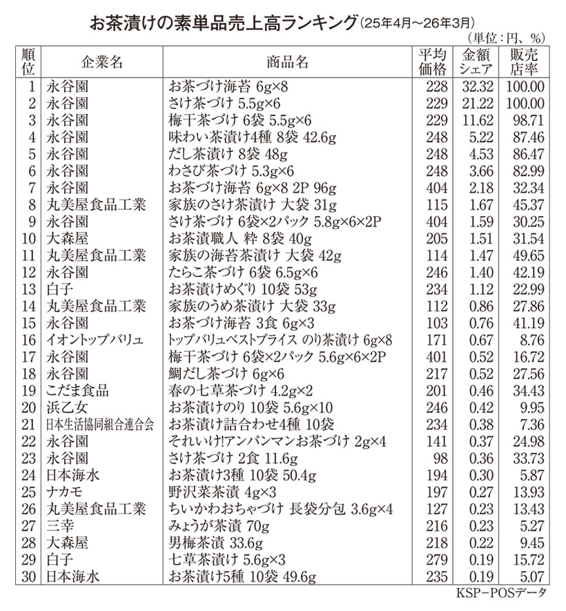 お茶漬け市場は26年3月期、前年実績並みで着地したとみられて需要が高止まりしている。主原料の海苔の不作が相次いで毎年の値上げ、値締めを余儀なくされ、販売減を最小限に食い止めている。