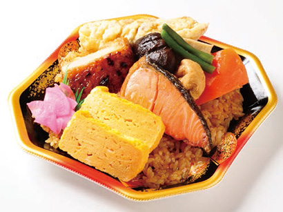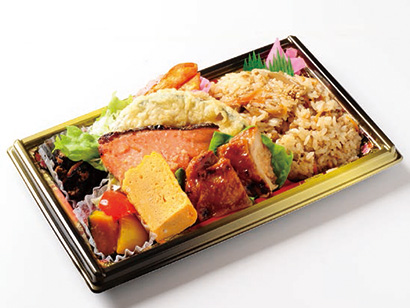 内容:釜飯風炊き込みご飯、チキン照り焼き、鮭塩焼き、ちくわ天ぷら、煮物(ニンジン、椎茸、高野豆腐、がんもどき、サヤインゲン)、卵焼き、ほか
