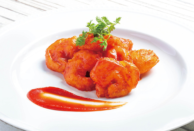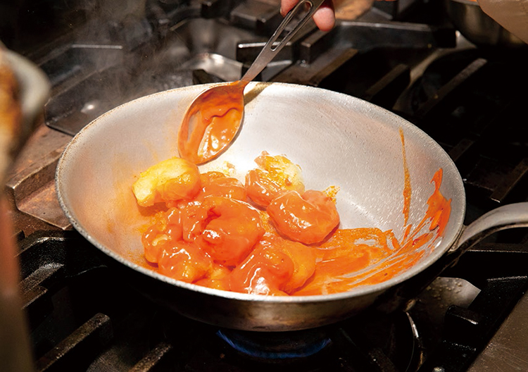 エビフリッターと、「トマトケチャップ スパイスアップ」にマヨネーズを加えたオーロラソースを、フライパンで加熱しながら絡める。同品は加熱するとスパイスの香りが立って風味がアップ