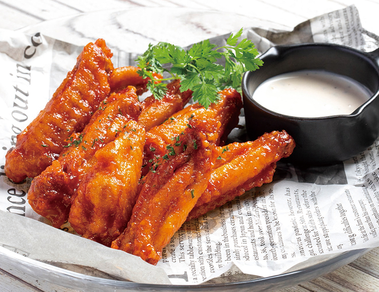 「バッファローチキン スパイスアップ」は、素揚げにした鶏肉の手羽を「トマトケチャップ スパイスアップ」にホットソース、ハチミツを加えたタレで絡めた。「お酒に合わせる料理なので、味付けは後を引くような風味を目指した。パンチを出すためにホットソースで辛さを強め、スパイス感と合わさって、深みのあるおいしさに仕上がった」ようだ。