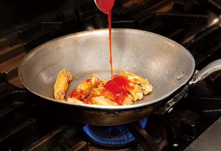 写真3:揚げた手羽をバターで炒め、「トマトケチャップ スパイスアップ」+ホットソース+ハチミツで合わせたタレとともに炒め合わせる。“スパイスアップ”というキーワードがまたお酒飲みに響く。(11月上旬から約2週間の期間限定で販売)
