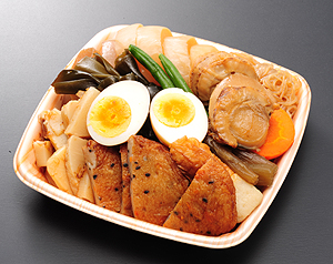 便われる素材は大根、コンニャク、ホタテなど約12種類。素材の持ち味を十分に生かすため、それぞれを単品で炊き込み、炊き上がった個々の煮物を容器に盛り合わせる。煮物作りが始まるのは毎日夜中の1時。仕込み、炊き込み、冷却、盛り合わせ作業を経て、朝6時頃、売り場に陳列される。その時間帯から弁当の盛り付けが始まり、開店10時までに弁当が陳列される。この一連作業が終日繰り返される。