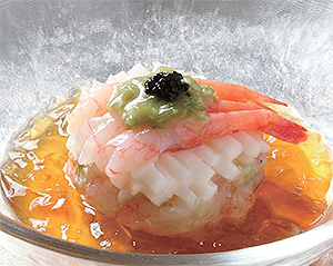 (3)セルクルに(1)(2)の順で詰め、型を抜き、甘エビ、「シャキシャキわさび」、ランプフィッシュキャビアを飾る。