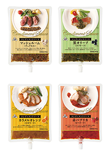 「コンディメント=condiment」とは「調味料・薬味」の意味。肉や魚などの料理に付けて食べる「贅沢な洋風の薬味ソース」を掲げソースの新分野を提案する。各250g(冷凍)