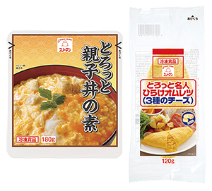 「とろっと親子丼の素」(左)、「とろっと名人ひらけオムレツ(3種のチーズ)」(右)