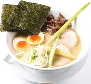 「特製 豚白湯」880円(税込み)トッピングは彩りの見栄えまで気を配る。チャーシュー、煮卵、キクラゲ、アスパラ、ヤングコーン、刻みネギ、海苔