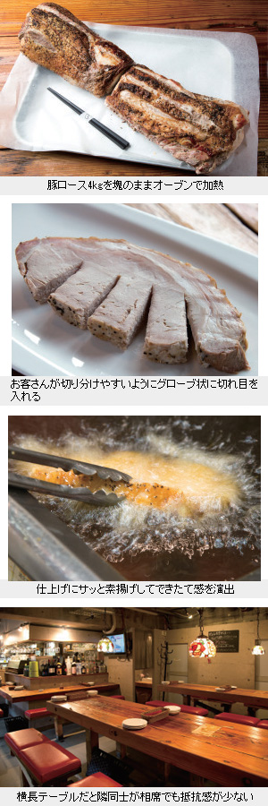 まず豚ロース肉4kgをオーブンで焼き、8割方火を通す。1人分=200gに切り分け、さらにお客さんが切り分けやすいように、グローブ状に切れ目を入れる。ここまで仕込んでおくことで、提供時間が劇的に短縮。注文を受けてから、なんと3分で提供できるという、カップラーメン並みの早さだ。