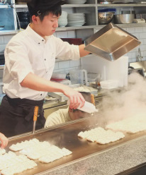 接客スタッフは合わせて15カ国語が話せるグローバルスタッフが揃っており、オープンキッチンの鉄板でライブ感たっぷりにギョウザを焼き上げる。メニューは「GYOZA」(6個・400円・税抜き、ニンニク抜きもあり)、合鴨肉を用いた「ワインに合うカモ!GYOZA」(6個・600円・税抜き)など。サンチュで巻いて食べる韓国焼肉のような食べ方や、6種のたれ(トマトソース、白ポン酢、トリュフ塩、粒マスタード、ユズコショウ、昆布のふりかけ)など新たなたれの提案をしている。同社では5年間で延べ30万人の来場を目標としている。