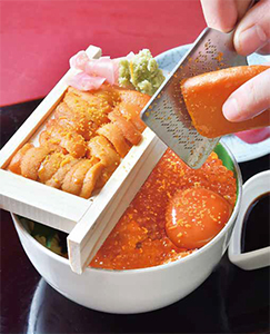 丼にのせるのは、イクラ約100gと板ウニ1枚(50~60g)、大分のブランド卵「蘭王」の黄身。それだけでも豪華だが、その上で削ってかけてくれるのがカラスミ。客がストップを出すまでOKという、太っ腹なメニューだ。