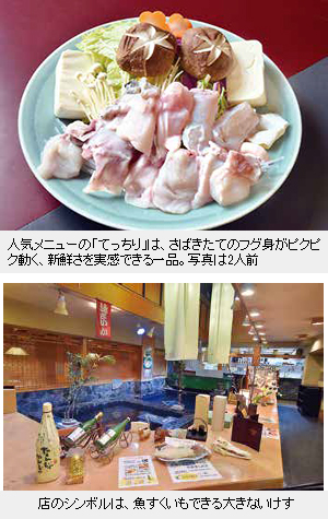 同店には大きないけすがあり、鮮魚料理や大阪懐石料理が自慢の店。泳ぎイカの姿造りは、ファンが多い名物料理となっている。また、年間を通じて多彩な鍋料理を提供しており、活きのトラフグをさばく「てっちり」(1人前3434円)は、夏場も需要が落ちない人気メニューである。