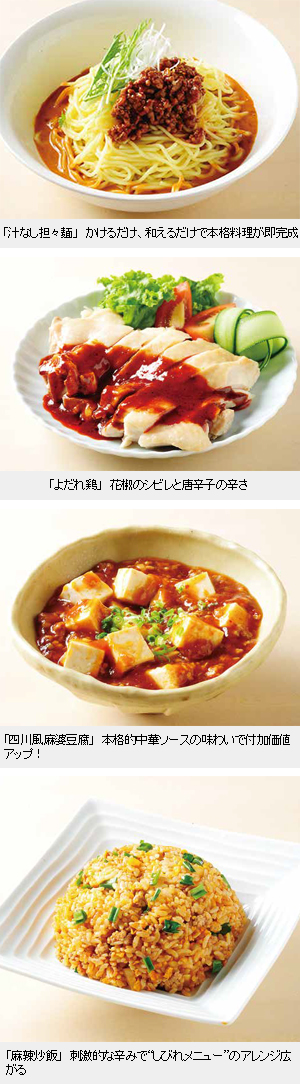 ユーザーからの評価は高く簡便なオペレーションながら本格的なメニューを実現できることやそのしびれる辛味への評価に加え、常温であることや290gというサイズも現場の支持を集めている。もちろん「花椒辣醤ソース」はよだれ鶏だけでなく、汁なし担々麺や麻辣炒飯、四川風麻婆豆腐などさまざまなメニューに手軽にアレンジできる。テーオー食品は中華系調味料に「葱生姜醤」を16年9月に発売し、この商品も人気を集めている。同社は「花椒辣醤ソース」などの発売により中華系調味料のメーカーとしての存在感を今後、さらに高めていく考えだ。