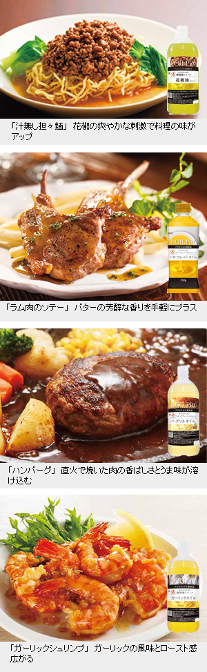 展開するフレーバーの豊富さにも要注目だ。定番の「ガーリックオイル」や「バターフレーバーオイル」の他、卵を高温調理する際の、あの香ばしさを閉じ込めた「たまご香味油」、フランス料理などで使用される香味野菜の豊かな香りとおいしさを凝縮させた「ミルポワオイル」など全17品種に及ぶラインアップは、他の追随を許さない。今春からは 肉を直火で焼いたような香ばしさとうま味を増強する「グリルオイル」を商品化。肉メニュー人気を背景に反響が予想される。