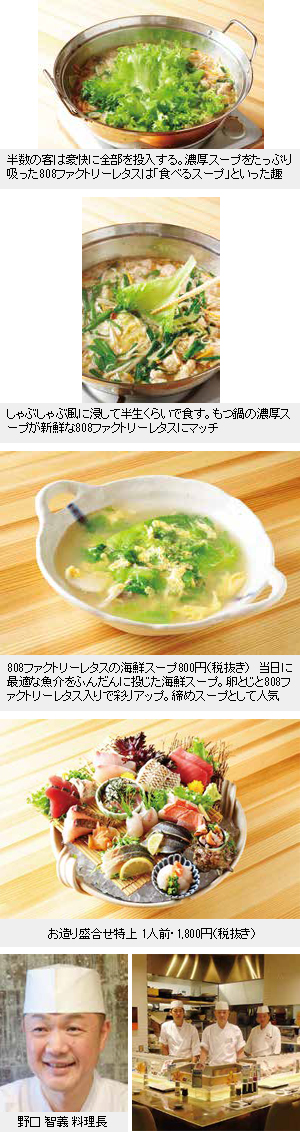 その代表格は、「808ファクトリーレタス」をしゃぶしゃぶ風に用いた「もつ鍋」と、大根のツマを808ファクトリーレタスに代えた「お造り」だ。いずれも料理自体は一般的だが、「グリーンの808ファクトリーレタスを添えたことで、明るい雰囲気と健康イメージが理想的にアップした」(野口智義料理長)と語り、「濃厚スープを吸ったレタスも美味」と相乗効果を説く。