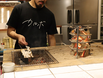 お客の目の前のオープンキッチンで炭火焼き調理が行われる