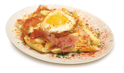 エストレジャードス 700円(税込み) ポテトフライ、生ハム、目玉焼きにアリオリソースをかけ、混ぜて食べるスペインの人気ジャンクフード。通称「ぐちゃぽて」