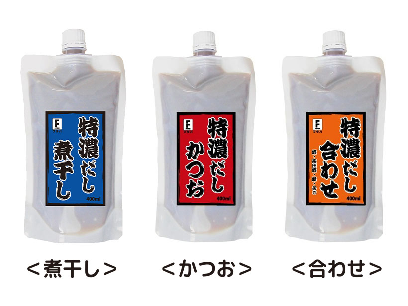 だしのうまみを凝縮した濃厚な希釈タイプの液体だし。深みのあるうまみと力強いコクにこだわった一品。味わいにだしの奥行きを付与できる。「煮干し」はインパクトのある煮干しスープが完成。「かつお」は鰹節をそのまま食べているような濃いうまみ。「合わせ」は鰹、宗田鰹、鯖、アゴの素材を使った力強い味わい。