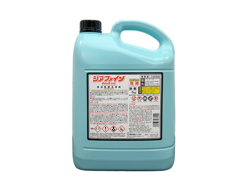 従来の「ケミファイン クイックすすぎ」と同タイプの発泡洗浄剤。次亜塩素酸ナトリウム(塩素)を新配合し、カビやたんぱく汚れへの洗浄力と除菌力をアップした。排水溝周りの汚れも同時に除去し、清潔な環境を保持。専用の噴霧ツールとノンブラッシング洗浄、優れたすすぎ性により、清掃の短時間・省力化を実現する。