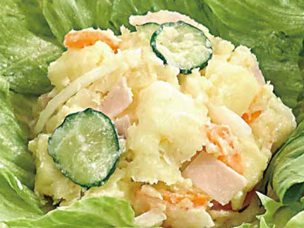 「きゅうりスライス」は、加熱工程が入るので、通常の塩をしてから水分を絞る調理工程が不要になり、かつ安心してそのまま使える点がスゴイところ。特に相性の良いメニューは、ドレッシングやマヨネーズなどの脂が入った調味料を使ったもの、とのことなので、ポテトサラダに最適のきゅうり、なのです。