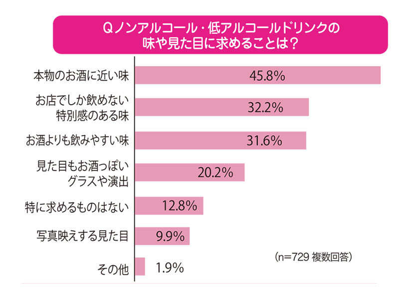 また、ノンアルコール・低アルコールドリンクの味や見た目に求めるのは「本物のお酒に近い味」45.8%、「お店でしか飲めない特別感のある味」32.2%、「お酒よりも飲みやすい味」31.6%でした。お酒を飲んだ気分になれることを求めながら、お酒よりも飲みやすい代替手段として捉えている人が多いようです。