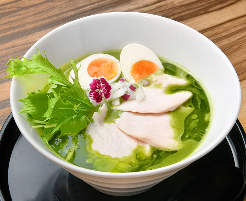 抹茶を合わせたラーメンスープも登場。写真は大阪市都島区「麺屋 いち山(ICHIZAN)」の「京都宇治の抹茶鶏白湯 味玉付き」(1,200円税込み)/外食レストラン新聞25年10月号より