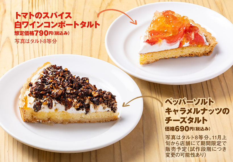 「ベイクドチーズタルト」はホイップクリームを塗り、同店の既存メニュー「スパイシーキャラメルナッツ」をアレンジし、くだいたナッツをトッピングした。クリームチーズのコクとほのかな塩味に、ブラックペッパーをかけたキャラメルナッツを合わせた大人の味わいだ。「フリーカットケーキ タルト」は既存メニューをトッピングするだけのアレンジにも活躍し、「3~4分で完成する。既存メニューをのせるだけだからオペレーションの負担をあまりかけず、新メニューを簡単に作れる」(同)という。