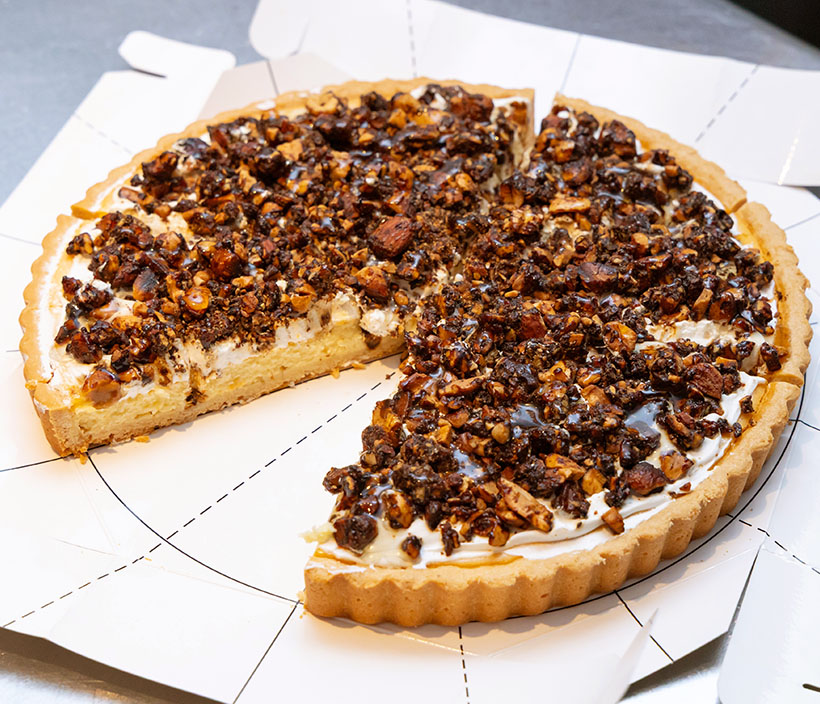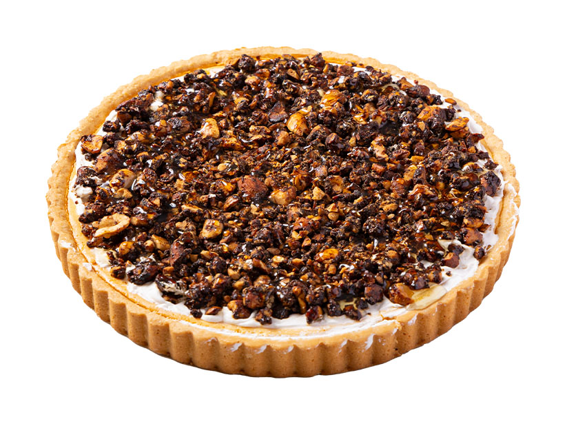 【ペッパーソルト キャラメルナッツのチーズタルト】「ベイクドチーズタルト」にホイップクリームを塗り、フライパンでナッツをソテーしてキャラメルシュガーを絡め、ブラックペッパー、塩を加えた“キャラメルナッツ”を上面に盛り付けて完成