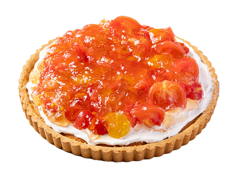 【トマトのスパイス 白ワインコンポートタルト】「プレーンタルト」にホイップクリームを塗り、白ワイン、上白糖、レモン、クミンシードでコンポートしたミニトマトを盛り付け、コンポート液で作ったゼリーを塗って冷やしたら完成