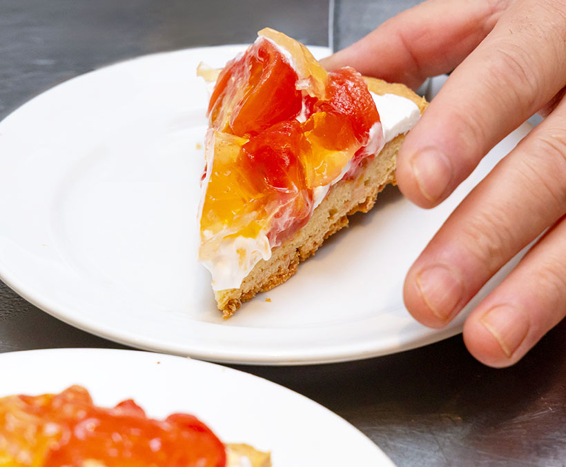 今回のメニュー開発に使用したのは「プレーンタルト」と「ベイクドチーズタルト」。「プレーンタルト」はホイップクリームを塗り、トマトのコンポートを合わせた。シンプルなタルトの味わいが上品で、トマトの爽やかな甘酸っぱさとホイップクリームがマッチし、食後でもすいすいと食べやすい。本格的な手作りタルトそのものだが、「前日から漬け込んだトマトを使えば、仕上げるのに約10分程度」(青島氏)と手軽に完成する。